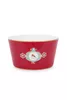Eine rote Schale die in der Mitte ein Medaillon mit ein wunderschönes Rotkehlchen. Im Inneren der Schale setzen sich Elemente aus dem Dessin fort. Der Rand ist mit Gold versehen. Lässt sich hervorragend mit dem übrigen Geschirr aus der Love Birds Kollektion kombinieren.