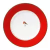 Verziert mit einem roten Rand und goldenen Details. In der Mitte ist der Teller mit ein wunderschönes Rotkehlchen versehen.